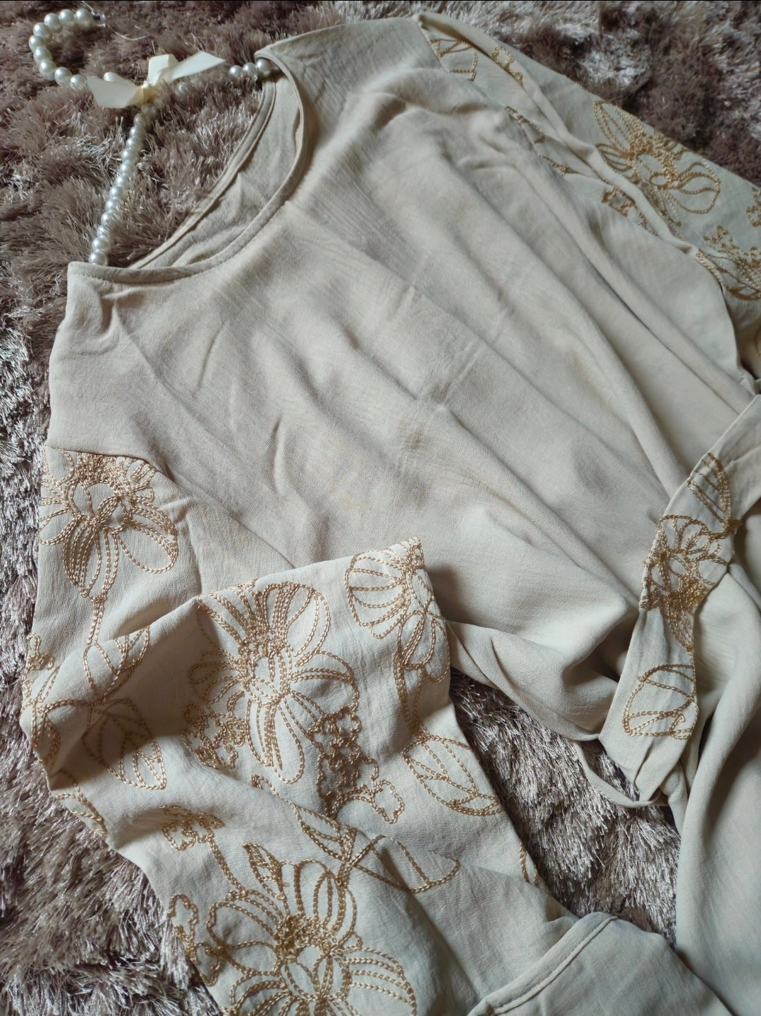 Die zarten Blumenstickereien an den Ärmeln setzen einen dezenten, femininen Akzent, ohne aufdringlich zu wirken.